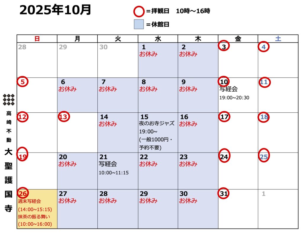 2025.10.02 10月の予定について 大聖護国寺10月カレンダーを公開いたします。 各種行事予定は【お知らせページ】よりご確認ください。 夜のお寺ジャズについてはこちらをご確認ください。 内容につきましてご不明な点がありましたら【お問い合わせページ】からご確認ください。