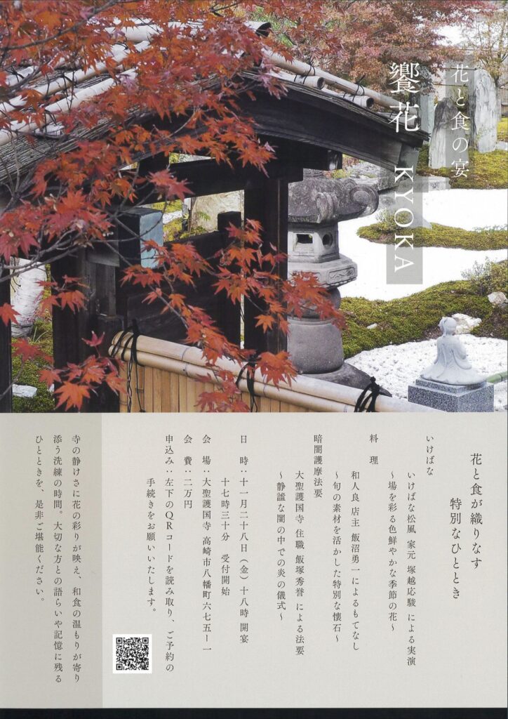 2025.10.27 饗花(KYOKA)花と食の宴の開催について 11月28日(金)18:00から大聖護国寺にて【饗花(KYOK A)花と色の宴】が開催されます。 完全予約制のため、参加を希望される方は末尾の画像のQRコードよりお申し込みください。