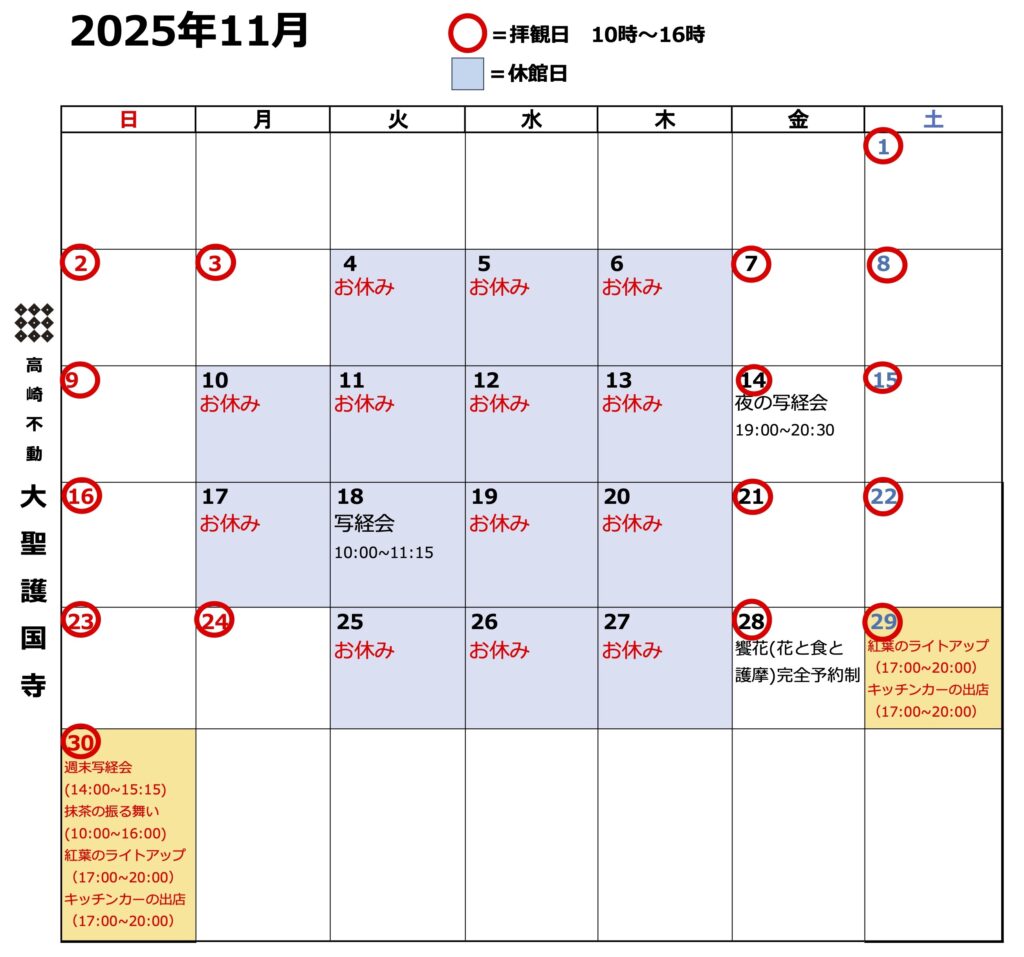 2025.10.27 11月の予定について 聖護国寺11月カレンダーを公開いたします。 各種行事予定は【お知らせページ】よりご確認ください。 内容につきましてご不明な点がありましたら【お問い合わせページ】からご確認ください。