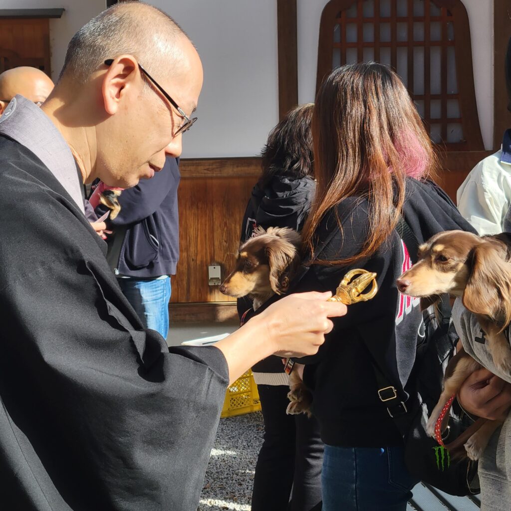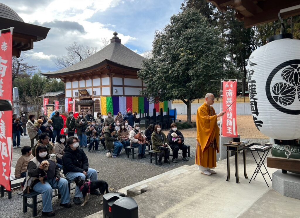 大聖護国寺本堂前でワンちゃん・ネコちゃん等の今年一年の厄除け、健康を祈願いたします。