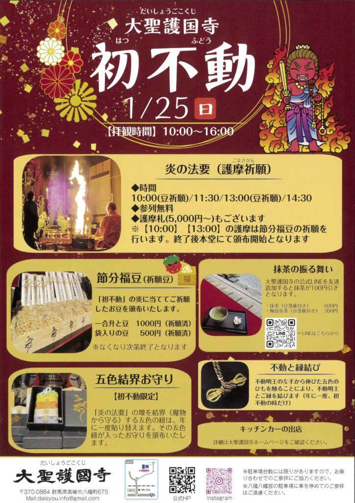 車:お寺駐車場有り(大聖護国寺駐車場50台・1/25のみ臨時駐車場20台程度)